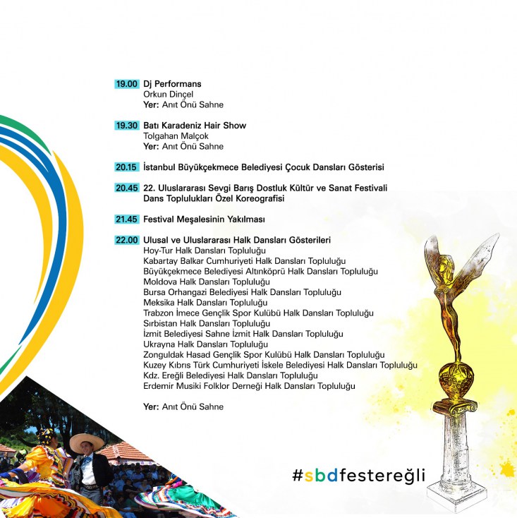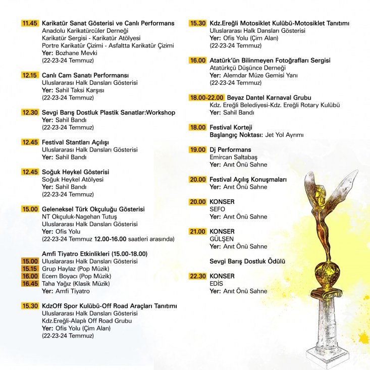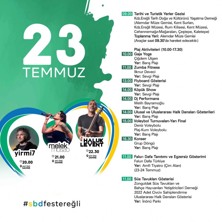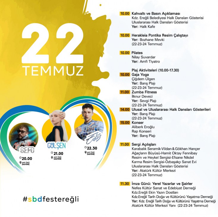 Karadeniz Ereğli’de geleneksel olarak her yıl düzenlenen Uluslar arası Sevgi Barış Dostluk Kültür ve Sanat Festivali’nin 22’ncisi 21-22-23-24 Temmuz’da gerçekleştirilecek. Türkiye’nin en büyük festivalinde, yıldızlar geçidi yaşanacak. Dünya halk dansları örnekleri, cam sanatçıları gösterileri, sokak sanatçıları, karikatür, resim çalıştayları, sergiler, kitap imza günleri, plaj ve spor etkinlikleri, Cehennem Ağzı Mağarası konserleri 4 gün boyunca tüm şehri kaplayacak. Kostümlü Festival Korteji renkli görüntülere sahne olacak. 22 Temmuz akşamı Sefo, Gülşen ve Edis, 23 Temmuz akşamı, Yirmi7, Melek Mosso, Haluk Levent, 24 Temmuz akşamı Madrigal, Koray Avcı ve Yıldız Tilbe sahne alacak.