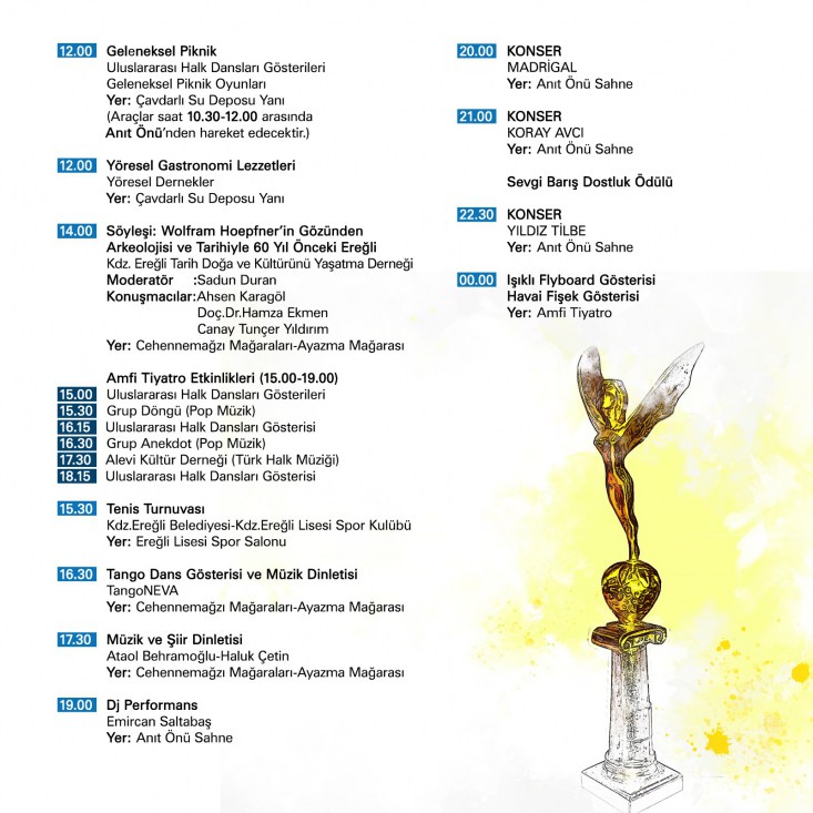 Cehennemağzı Mağarası etkinlikleri kapsamında TangoNEVA sahne alacak. Ataol Behramoğlu-Haluk Çetin müzik ve şiir dinletisi gerçekleştirilecek. Festival’de ayrıca sürpriz isimlere Sevgi Barış Dostluk Ödülleri verilecek.