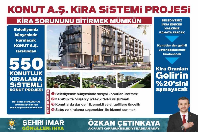 Çetinkaya, seçilmeleri halinde görev süreleri boyunca 2 bin 100 adet konut yapacaklarını bildirdi. Konutların ilk olarak Adatepe, Kartaltepe, Fevzi Çakmak, Kayabaşı, Namık Kemal, Soğuksu, Yeni ve Kurtuluş mahallelerinde yapılmasının planlandığını ifade eden Çetinkaya, “2100 adet Karabük’e konut kazandıracağız. İlk 5 yılda, bunun üstü olur altı olmaz. Burada öncelikli mahallelerimiz Adatepe, Kartaltepe, Fevzi Çakmak, Kayabaşı, Namık Kemal, Soğuksu, Yeni Mahalle, Kurtuluş gibi değişime, gelişeme ihtiyaç duyulan mahalleler. Deprem fay hattı şehrimizin 40 kilometre yakınından geçiyor. Bu depreme dayanıksız kısmı var, ayrıca şehre baktığımız hemşehrilerimiz 95 ve daha eski binalarda oturması açıkçası bizim vicdanımız el vermiyor. Depreme dayanıklı, modern yaşam alanları üretmeye başlayacağız. Burada Karabük’ün ihtiyaçları belli, yeni konuş stoğunu artırmak, daha modernize etmek, bunları bizler üreteceğiz. 1+1, 2+1, 3+1 olmak üzere şuan ki planlarımız ve maliyetler çerçevesinde 1,5 milyon ile 1 milyon 900 bin TL arasında halkımızın hizmetine sunacağız” dedi.