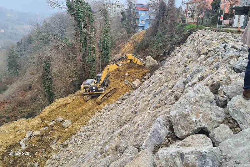 Zonguldak’ın Alaplı Büyük Tekke köyünde, toprak kaymalarına karşı tehlike arz eden noktalarda istinat duvarı yapım çalışmalarını sürüyor.