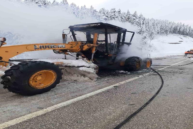 Kastamonu’nun Daday ilçesinde kar yağışının etkili olduğu yolda küreme çalışması yapan greyder, çıkan yangında kullanılmaz hale geldi.