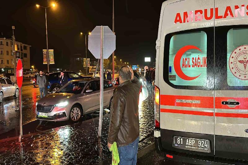 Olay, Bahçeşehir bağlantı yolu üzerinde meydana geldi. Alınan bilgilere göre, Düzce’den Bahçeşehir istikametine seyir halinde olan Arif K. idaresindeki 34 HOD 058 plakalı Nissan marka cip, Metek kavşağında Mehmet Ş. idaresindeki 54 AEU 074 plakalı Fiat marka araçla çarpışarak savrularak trafik ışığını devirdi. İhbar üzerine bölgeye sağlık ve polis ekipleri sevk edildi. Kazada Fiat marka otomobil sürücüsü Mehmet Ş. ve eşi Ayşe Ş. yaralandı. Ambulansa alınan 2 yaralıdan Mehmet Ş., ambulanstan inip olay yerine bakınca gözlerine inanamayıp kısa süreli tepki gösterdi. Daha sonra sürücü ambulansa alındı. Kaza sebebi ile tek şeritten verilen yol araçların kaldırılmasının ardından normal seyrine döndü. Kaza ile ilgili inceleme başlatıldı.