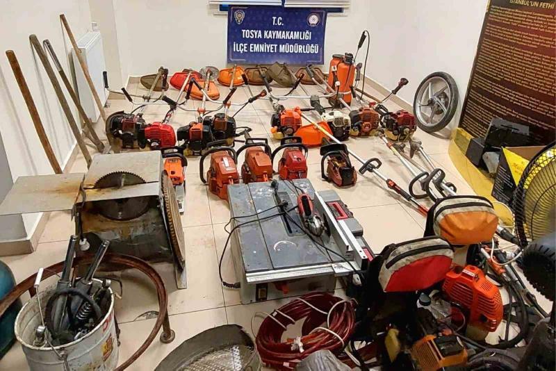 Edinilen bilgiye göre, Tosya ilçesinde bağ evlerinden gerçekleşen hırsızlık olaylarıyla ilgili Tosya İlçe Emniyet Müdürlüğü ekipleri, çalışma başlattı. 34 kameranın 420 saatlik video kaydını inceleyen ekipler, bağ evlerine giren şahısların H.Ö. ve S.G. olduğunu tespit etti. Hırsızlık şüphelilerine yönelik düzenlenen operasyonda 3 ikamet ve 1 araçta arama yapıldı. Yapılan aramada 15 adet ot biçme makinesi, 5 adet motorlu testere, 2 adet sehpalı hızar, 8 adet jant, 5 adet araç lastiği, 8 adet tüp, 2 adet ses sistemi, 1 adet dalgıç motor, 1 adet araç teybi, 2 adet ilaçlama makinesi, 1 adet soba, 1 adet elektrikli ısıtıcı, 2 adet amortisör, 3 adet kazma, 1 adet ocak, 4 adet katlanır kamp sandalyesi ve çok sayıda muhtelif eşya ele geçirildi.
