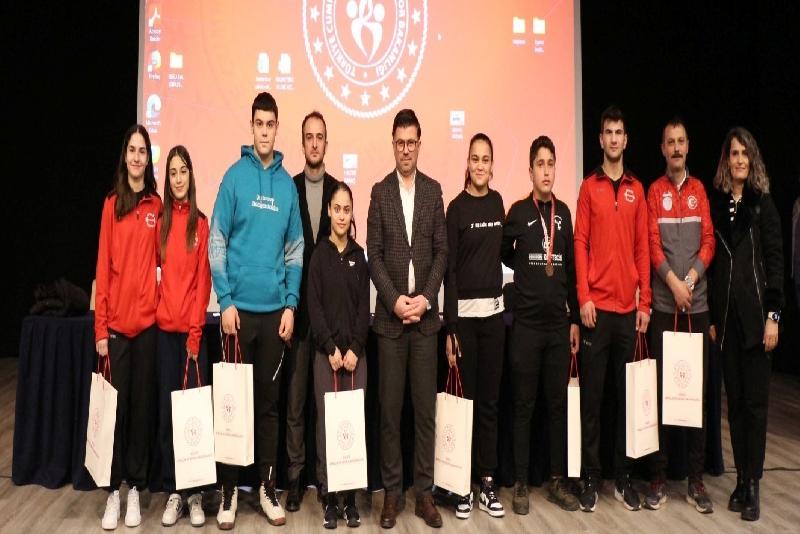 Toplantı sonunda İl Müdürü İsa Yazıcı başarılı sporculara hediye takdim etti.