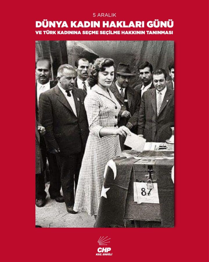 Cumhuriyet Halk Partisi (CHP) Kdz. Ereğli İlçe Örgütü Başkanı Zerrin Yılmaz Erdoğan, 5 Aralık Kadın Hakları Günü dolayısıyla bir mesaj yayımladı. Ulu Önder Mustafa Kemal Atatürk’ün “Dünyada her şey kadının eseridir” sözünden ilham aldığını belirten Erdoğan, kadınların eşit yurttaşlık haklarını kazandığı bu anlamlı günü gururla selamladığını ifade etti.