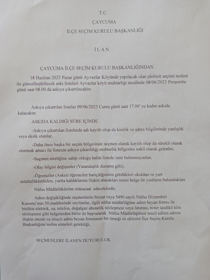 İlçeye bağlı Ayvazlar köyü Merkez Mahalle’sinde bulunan 163 seçmen sandık başına gidip oy kullanacak. Çaycuma Belediyesi sınırlarına dahil olmak için 18 Haziran 2023 Pazar günü ‘Evet’ yada ‘Hayır’ oyu vermek için referanduma gidip sandık başında oy verecek.