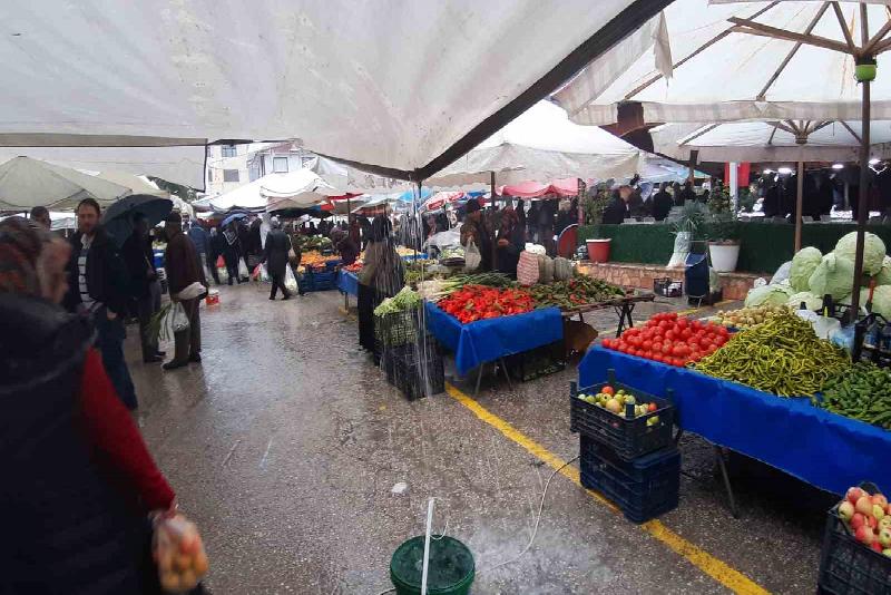 Bolu’nun Mudurnu ilçesinde aniden bastıran yağmur nedeniyle ilçe merkezinde kurulan pazar alanında, esnafların çoğu tezgahını kapatırken, yağmura hazırlıksız yakalananlar ise sığınacak yer aradı.