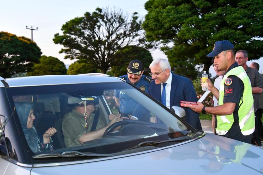 Bolu’da Kurban Bayramı tedbirleri kapsamında Bolu Valisi Erkan Kılıç trafik polisi ekipleriyle birlikte, tatil için yola çıkan sürücüleri yavaş gitmeleri ve emniyet kemerlerini takmaları konusunda uyararak araçta bulunan yolculara şeker, çocuklara ise çikolata ikram etti.