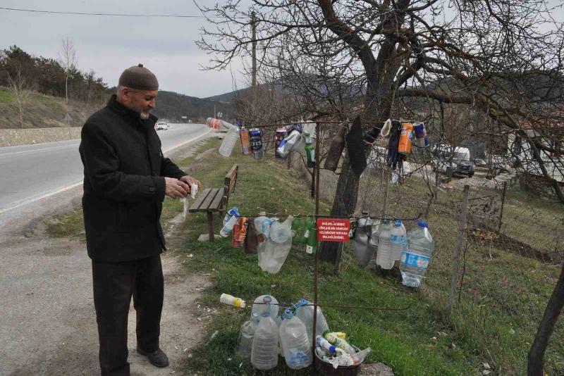 Mudurnu-Bolu yolu üzerinde yaptırdığı tüm çeşmelerde aynı çöp manzaralarının olduğunu belirten Pekyavuz, “Bundan sonra çeşmenin etrafına atılan çöpleri toplayıp bu standa asıyoruz. Bunu gören vatandaşlar çöp atmaz oldu. Yaz aylarında çocuk bezini dahil buraya atıyorlardı. Şuan da çöp atma işi bitti. Vatandaşlar bilinçlendi. Bir tane çeşmenin bana maliyeti 200 bin lira. Bu bana dokunmuyor ama buraya bir sigara izmariti atılması beni yıkıyor” dedi.