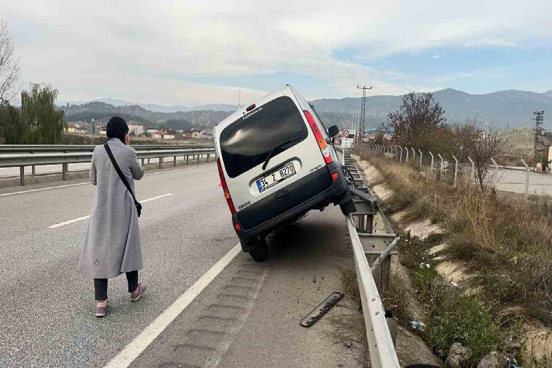 Kastamonu’nun Tosya ilçesi D100 karayolunda sürücüsünün direksiyon hakimiyetini kaybettiği hafif ticari araç çarptığı bariyerlerin üzerinde asılı kaldı.