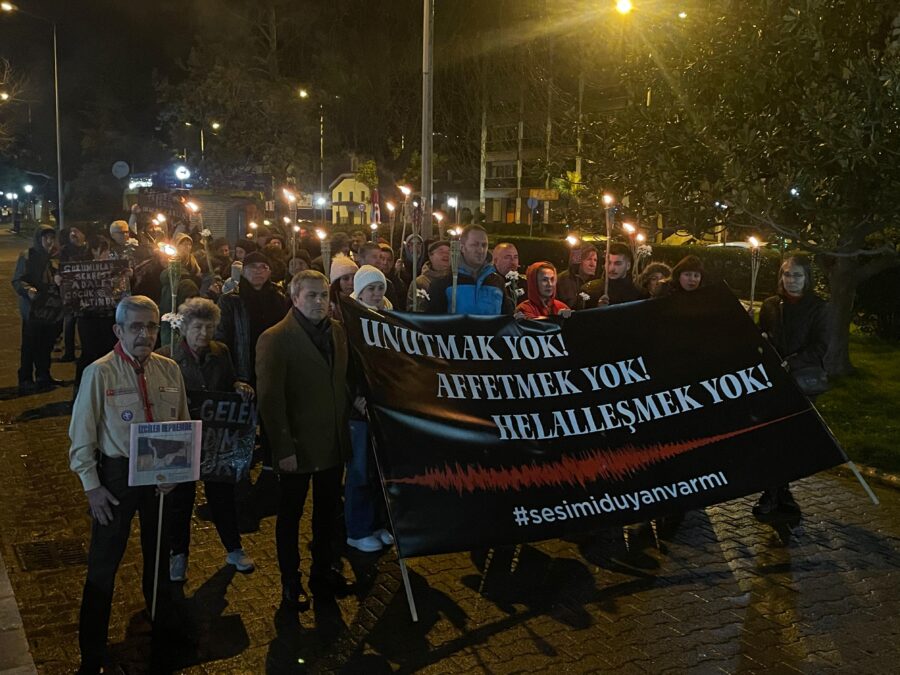 Günün ilk ışıklarıyla birlikte sahil bandındaki Bozhane-Çınaratı mevkisinde toplanan grup, ellerinde “Unutmak yok. Affetmek yok. Helalleşmek yok.” yazılı pankartla sessizce yürüyüşe geçti. Atatürk Anıtı önüne kadar süren yürüyüşün ardından, depremde hayatını kaybeden vatandaşlar anısına saygı duruşunda bulunuldu.