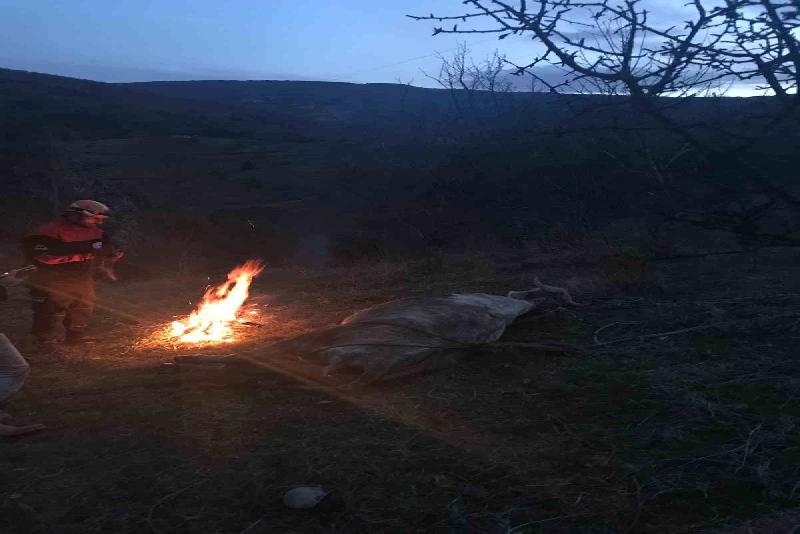 Karabük’ün Ovacık ilçesinde dere yatağına düşen hamile inek Afet ve Acil Durum Müdürlüğü (AFAD) ekipleri tarafından kurtarılırken, inek hipotermi geçirmesin diye ateşle ısıtıldı.