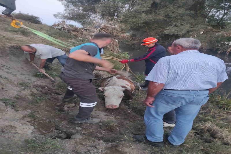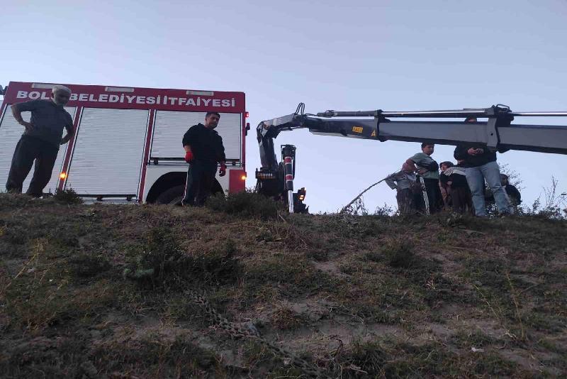 Bolu’nun Büyüksu Deresi’nde mahsur kalan inek, itfaiye ekiplerince vinç yardımıyla kurtarıldı.