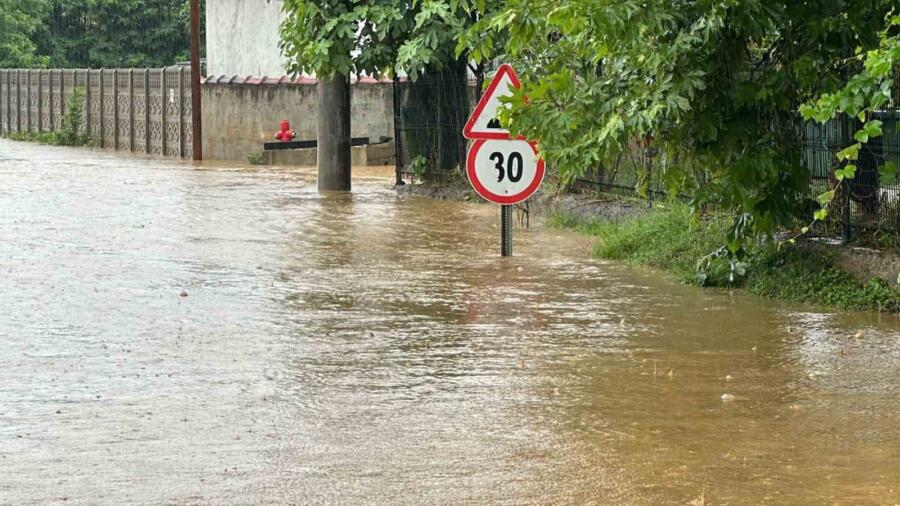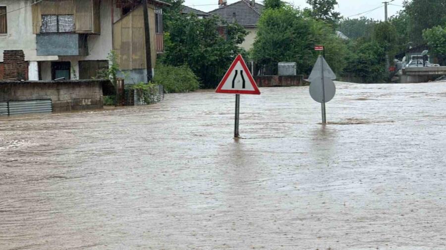 DÜZCE (İHA) – Düzce’de gece boyu devam eden yağışlar neticesinde Göndolaması köyünden geçen dere taştı, köy merkezi sular altında kaldı. Suya gömülen uyarı levhaları ise taşkının boyutunu gözler önüne serdi.