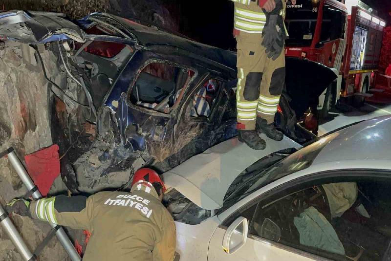 Düzce’de 3 aracın karıştığı zincirleme trafik kazasında 1 kişi öldü, 3 kişi yaralandı. Araçlardan biri kanala uçarak dik kaldı.