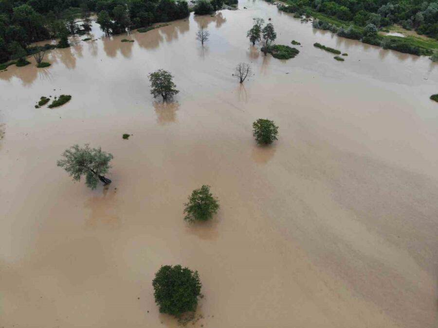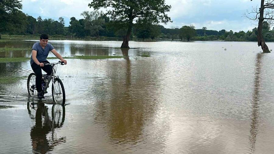 Sağanak yağışın şiddetli şekilde etkisini hissettirdiğini söyleyen Hakan Zengin, “Arkamda görülen beyaz tabelanın boyu benim boyumdan yüksek. Yağışın şiddeti buradan da belli oluyor. Efteni Gölü Kültür Park’a kadar taştı. Daha önce 2019 yılında meydana gelen sel afetinde bundan daha fazla bir taşma olmuştu. O zaman su ağaçlık alanların orada bulunan oturma alanlarına kadar gelmişti” dedi.