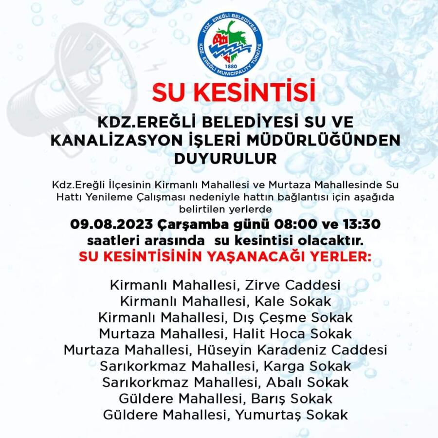 Zonguldak’ın Ereğli ilçesinde Su Hattı Yenileme Çalışması nedeniyle hattın bağlantısı için aşağıda belirtilen mahallelerde 09.08.2023 Çarşamba günü 08:00 ve 13:30 saatleri arasında su kesintisi olacaktır.