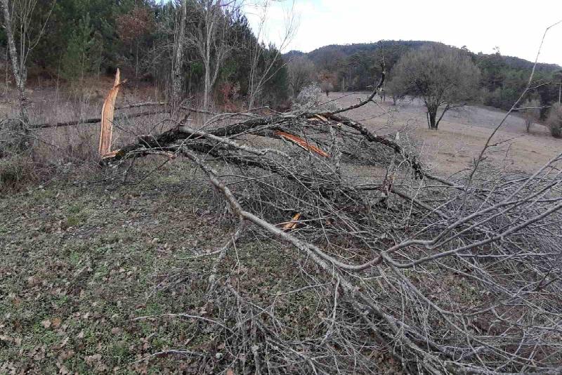 Bolu’nun Mudurnu ilçesinin yüksek kesimlerinde etkili olan rüzgar nedeniyle birçok ağaç devrildi.