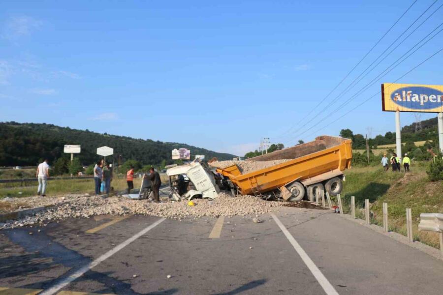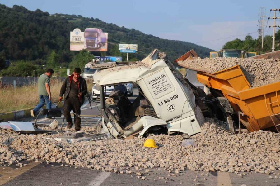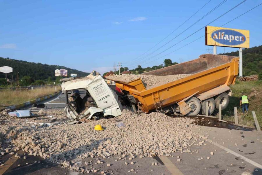 Bolu’da freni patlayan taş yüklü kamyon toprak yoldan D-100 karayoluna uçtu. Hurdaya dönen kamyonda bulunan 2 kişi yaralanırken, Ankara istikameti trafiğe kapandı.
