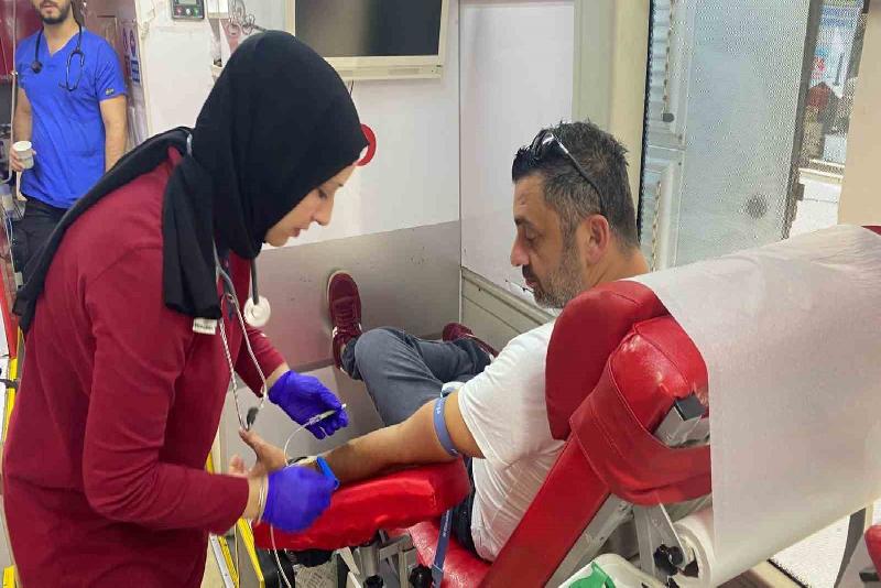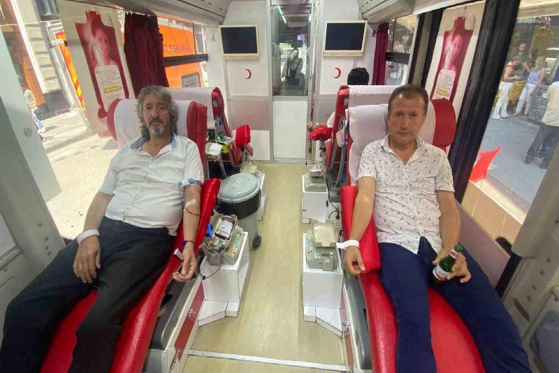 Gazeteciler, Kızılay’ın cadde üzerinde ki kan bağış aracına gelerek testlerden geçip kan verdi.