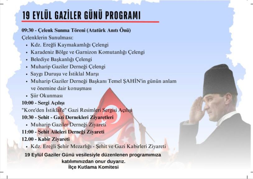 Karadeniz Ereğli Kaymakamlığının yazılı açıklamasına göre, Gaziler Günü dolayısıyla 19 Eylül saat 09.30’da Atatürk Anıtı’nda düzenlenecek törende, Anıt’a çelenkler konulacak, Saygı Duruşunda bulunulup, İstiklal Marşı okunacak.