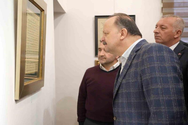 Vali Dallı ve Başkan Vekili Yurt, sergiyi gezerek hat sanatçısı Ahmet Kutluhan’dan eserler hakkında bilgiler aldı.