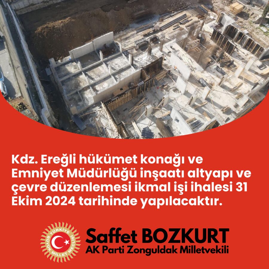 AK Parti Zonguldak Milletvekili Saffet Bozkurt, Kurban Bayramı öncesi yüklenici firmanın iflas etmesi sonucu yapımı durdurulan Kdz.Ereğli Hükümet Konağı ve Emniyet Müdürlüğü inşaatı altyapı ve çevre düzenlemesi ikmal işi yeniden ihaleye çıkarılacağı tarihi açıkladı