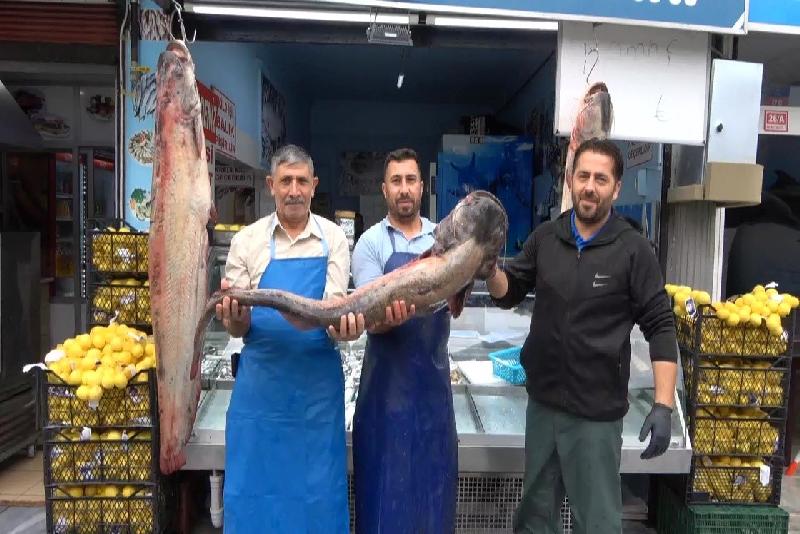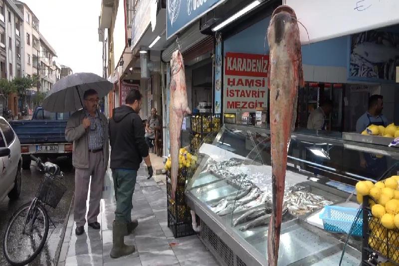 Düzce’de balıkçı tezgahına asılan yaklaşık 1 metre 60 santim boyundaki 2 yayın balığı vatandaşların ilgi odağı oldu. Balığı tezgahın önünde asılı gören vatandaşlar bol bol fotoğraf çektirdi.