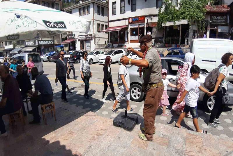 Mudurnu’nun Hüsamettin Dere köyünde ikamet eden 68 yaşındaki Durmuş Demirtaş, kendine özgü kıyafeti ve eğlenceli halleriyle ilçenin neşe kaynağı oldu. Bir elinde teyp, diğer elinde şimşir kaşığı ile Mudurnu’yu sokak sokak gezen Demirtaş, yöresel oyunlar oynayarak, vatandaşlara neşe saçıyor. İlçe merkezine gelen yerli ve yabancı vatandaşlar ise zaman zaman Demirtaş’a eşlik ederek, bol bol hatıra fotoğrafı çektiriyor.