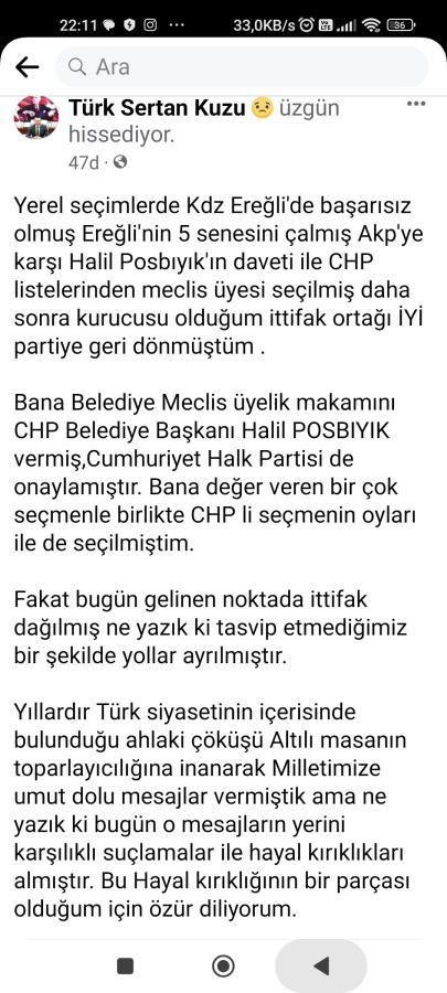 Yerel seçimlerde Kdz Ereğli’de başarısız olmuş Ereğli’nin 5 senesini çalmış Akp’ye karşı Halil Posbıyık’ın daveti ile CHP listelerinden meclis üyesi seçilmiş daha sonra kurucusu olduğum ittifak ortağı İYİ partiye geri dönmüştüm .