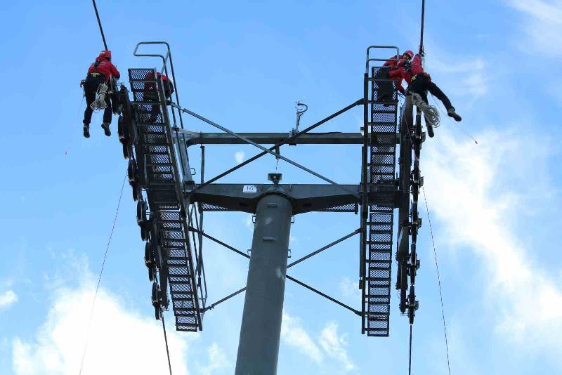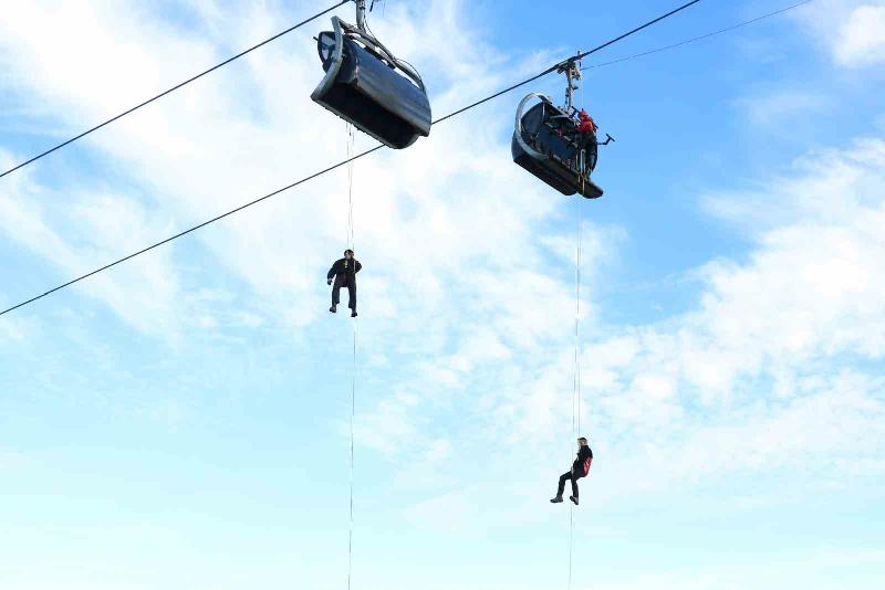 2 bin 330 metre yüksekliğe sahip Ilgaz Dağı Milli Parkı içerisinde bulunan kayak merkezinde senaryo gereği teleferikte mahsur kalan iki kişiyi kurtaran JAK timleri, telesiyej tellerine tırmanarak, halat üzerinde hünerlerini sergiledi.