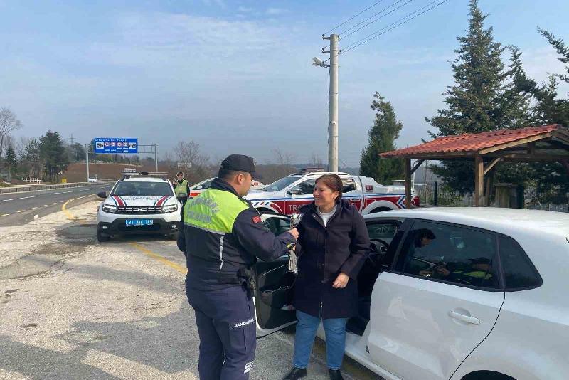 DÜZCE(İHA) – Düzce’de Jandarma trafik timleri tarafından yapılan denetimde durdurulan kadın sürücülerin 8 Mart Dünya Kadınlar Gününü kutladılar, çiçek verdiler.