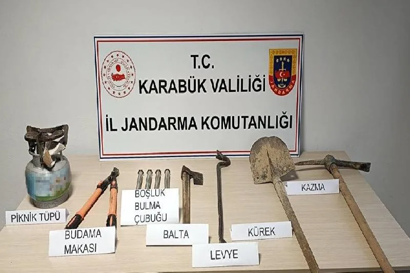 Edinilen bilgiye göre, Karabük İl Jandarma Komutanlığı ekipleri ilçeye bağlı Kadıbükü köyü Yayla Mahallesi mevkisinde kaçak kazı yapıldığı ihbarı üzerine bölgede yaptıkları çalışmada, F.K. (46), M.Ö. (48), M.G. (47), H.Ö (46) ve H.Y.’yi (65) kaçak kazı yaparken suçüstü yakaladı. Jandarma ekipleri, 2.5 metre kazılmış çukur tespit ederken, kazıda kullanılan; birer adet kazma, levye, kürek, balta, piknik tüpü, budama makası, 4 adet boşluk bulma çubuğu ele geçirdi.
