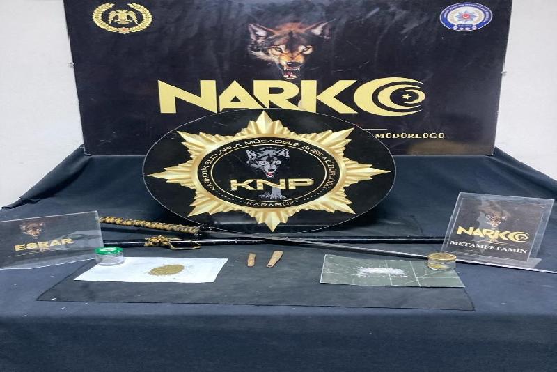 Polis ekipleri, Bölge Trafik Uygulama noktasında U.O.’nun durumundan şüphelenerek, şahsın araç ve üzerinde arama yapıldı. Aramada, 4.05 gram esrar, 3.55 gram metamfetamin, 2 adet içime hazır sigara vaziyetinde esrar, birer adet kılıç ve satır ele geçirildi.