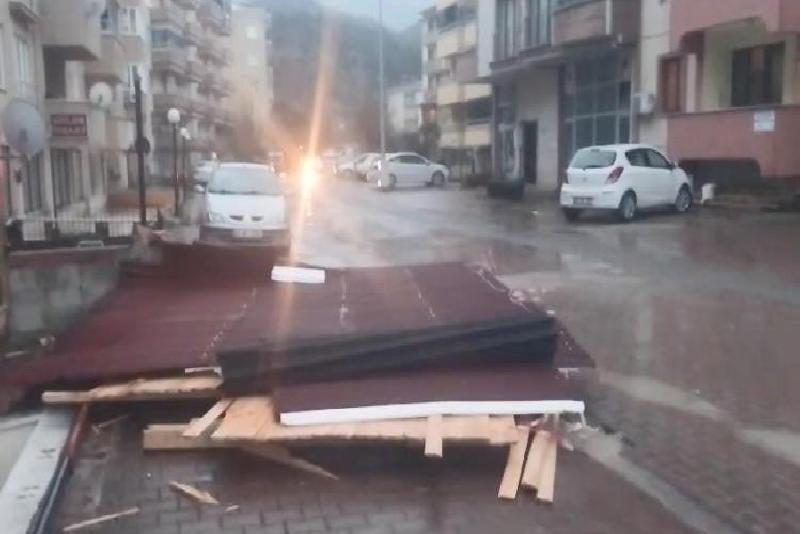 Meteorolojinin fırtına uyarısında bulunduğu Kastamonu’da etkili olan kuvvetli rüzgar hayatı olumsuz etkiledi. Cide ilçesinde fırtınanın şiddetine dayanamayan iki binanın çatısı uçtu. Uçan çatıların düştüğü alanda vatandaşların olmaması ihtimal faciayı önledi. Çatıları uçan binalarda ekipler tarafından güvenlik önlemi alındı.