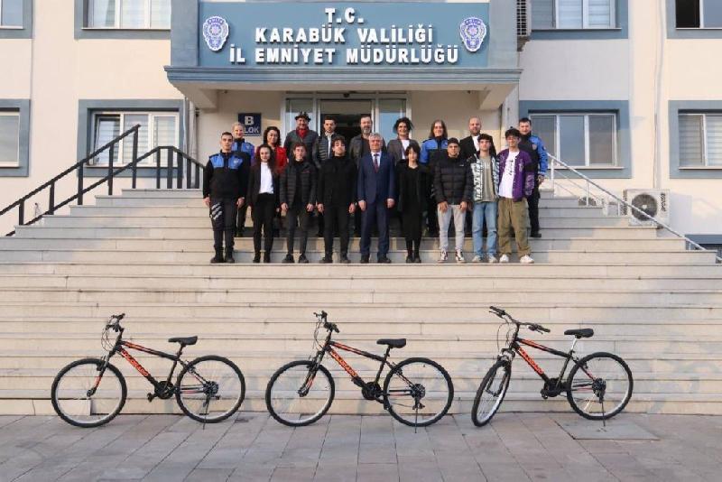 KBÜ Türker İnanoğlu İletişim Fakültesi öğrencisi Yusuf İzzettin Gürbüz’ün yanı sıra rehabilitasyon merkezi müdürü Esra Aydın, senarist öğretmen Levent Aslantaş ve öğrencilerin yer aldığı ekip, Karabük İl Emniyet Müdürü Mehmet Ali Hasan Köse’den bisiklet ödülünü aldı.