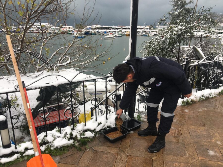 Ekipler kar yağışı nedeniyle yiyecek bulmakta zorlanan sokak hayvanları için kedi ve köpeklerin kolay ulaşabileceği park ve yeşil alanlara mama dağıtımı gerçekleştirdi.