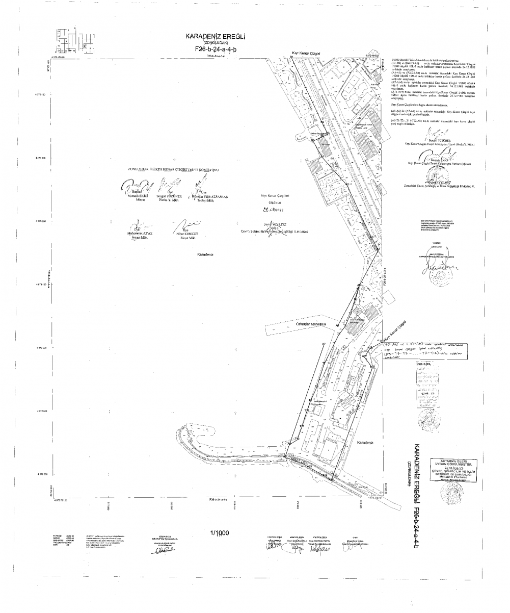 ‘Kdz. Ereğli Belediye sınırları içerisinde kalan Ereğli Belediye Başkanlığı tarafından onaylanan 1/1000 ölçekli 10.12.2021 onay tarihli güncel halihazır haritalara kıyı kenar çizgisi aktarımının talep edilmesi üzerine, bahse konu paftalara Müdürlüğümüzün Kıyı Kenar Çizgisi Tespit Komisyonunca 3621 sayılı Kıyı Kanunu ve Uygulama Yönetmeliği hükümleri doğrultusunda aktarım ve tespit işlemi yapılmış olup Bakanlığımızın onayına sunulmuştur.