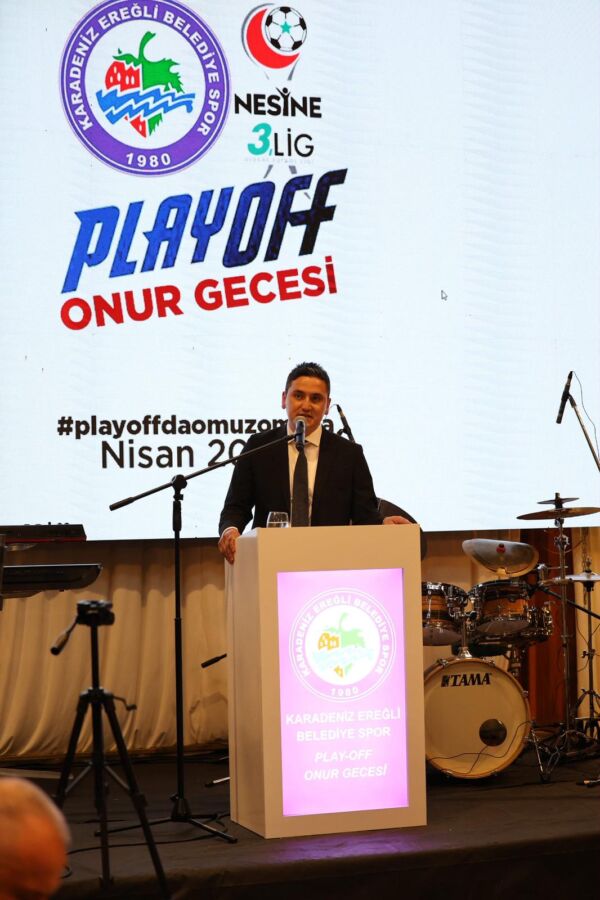 Kdz. Ereğli Belediyespor Kulübü tarafından organize edilen Play-Off Onur Gecesi, sezon başından bu yana takıma destek veren paydaşları ve şehir protokolünü bir araya getirdi. Play-Off maçları öncesinde moral depolamak ve şehirde birlik beraberlik ruhunu canlandırmak amacıyla düzenlenen organizasyon, büyük bir gövde gösterisine dönüştü.
