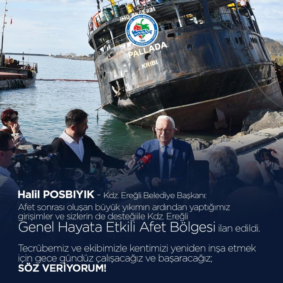 Kdz. Ereğli Belediye Başkanı Halil Posbıyık, tarihinin en büyük felaketini yaşayan Kdz. Ereğli’nin ‘Afet Bölgesi’ ilan edilmesi konusunda yaptığı açıklamaların ardından, bugün de basın mensupları ile afette ikiye bölünerek Amfi Tiyatro bölgesinde karaya oturan Kuru Yük Gemisinin olduğu bölgede basın açıklaması yaptı. Başkan Posbıyık net mesaj verdi: Yıkım büyük, kenti yeniden inşa edebilmek için Kdz. Ereğli’nin acilen afet bölgesi ilan edilmesi gerekli. ”