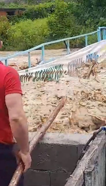 Kozlu’nun Ilıksu mevkisinde geceden bu yana etkili olan çok kuvvetli yağışın ardından derenin debisi yükseldi. Yükselen dere restoran ve evlere giden yolla birleşti. Derenin getirdiği odunlar bir yaya köprüsünün altında birikti. Vatandaşlardan biri köprünün altındaki odunlara müdahale ettiği sırada köprü yıkıldı. O anlar amatör kameraya yansıdı.