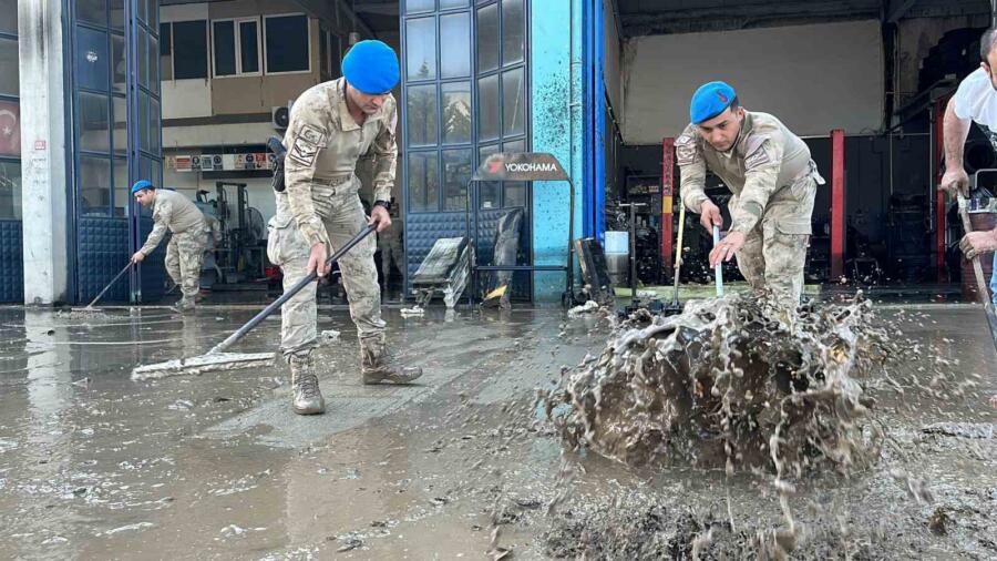 Yoğun yağmur sebebiyle Düzce’de yaşanan sel felaketinin ardından başlatılan çalışmalarda bölgede görevli Mehmetçik de yer aldı. Askerler işletmelerin temizlenmesine yardım etti.