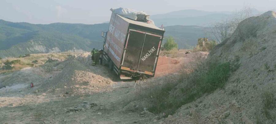 Karabük’te toprak yığınına saplanan nakliye kamyonunun sürücüsü yaralandı.