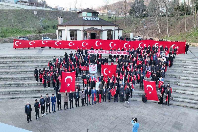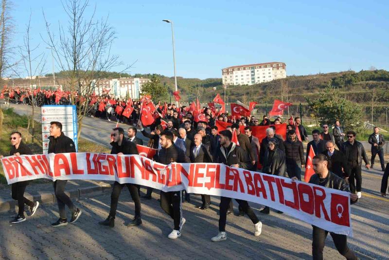 Türkiye’nin 7 bölgesi ve 81 ilinden 30 binin üzerinde öğrencisi bulunan Düzce Üniversitesi bünyesindeki öğrenci topluluklarım birlikte düzenlediği yürüyüşe, ellerinde Türk bayraklarıyla katılan öğrenciler, Fen Edebiyat Fakültesi’nden başlayarak, 15 Temmuz Demokrasi Meydanı’na kadar sloganlar eşliğinde yürüdü.