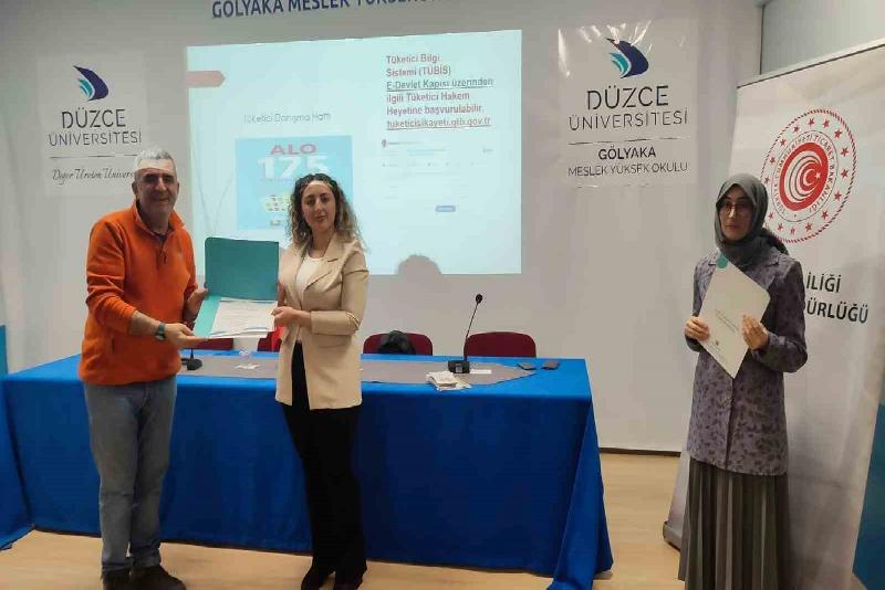 Gölyaka Meslek Yüksekokulu Yönetiminin talebi doğrultusunda düzenlenen programda; tüketici hakları, bilinçli tüketici davranışları ve tüketici hakem heyetine başvuru yolları başlıkları altında faydalı bilgiler paylaşılarak, Düzce Üniversitesi öğrencilerinin merak ettiği sorular cevaplandı.