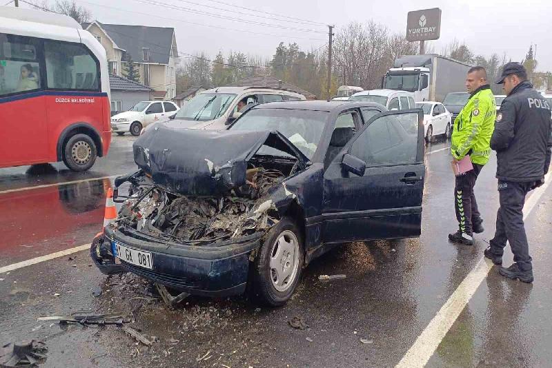 Kaza, D-655 karayolu Yığılca Işıklı kavşakta meydana geldi. Edinilen bilgilere göre, A. T. 34 GUG 612 plakalı kamyon kırmızı ışıkta durduğu esnada yağışlı hava nedeniyle kayganlaşan yolda durmayan H. E. idaresindeki 81 GA 081 plakalı otomobil arkadan çarptı. Çarpışmanın etkisiyle otomobilin motor kısmı hurdaya dönerken otomobil sürücüsü H. E. ise yaralandı. 112 Acil Çağrı merkezine yapılan ihbar üzerine bölgeye sağlık ve polis ekipleri sevk edildi. Sağlık ekipleri yaralıya yaptıkları ilk müdahalenin ardından Düzce Üniversitesi tıp Fakültesi Hastanesi’ne kaldırılarak tedavi altına alındı. Kazaya karışan araçlar polis ekiplerinin de yardığımı ile kaldırılarak yol trafiğe açıldı. Kazayla ilgili inceleme başlatıldı.