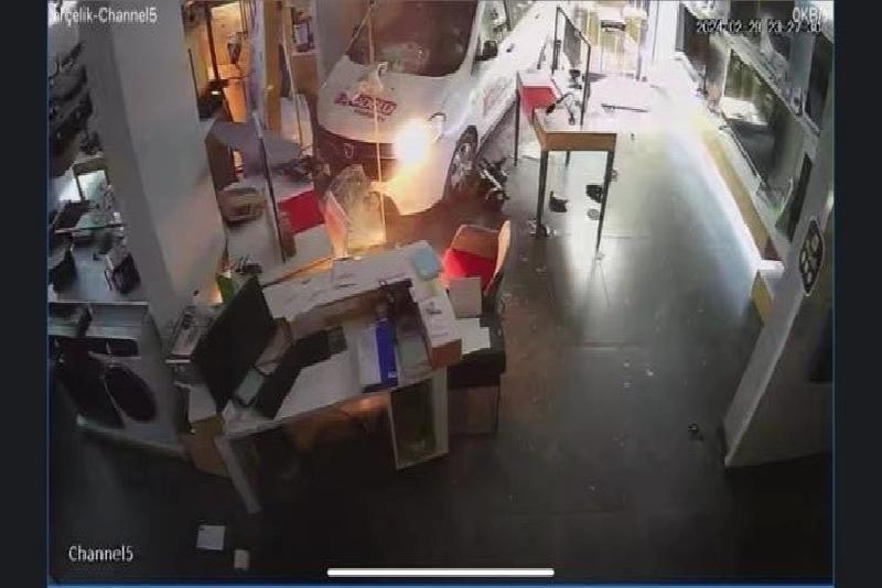 Görüntülerde çarpışmanın etkisiyle hafif ticari aracın dükkana girdiği ve araç sürücüsünün telefonla kazayı bir yakınına bildirdiği yer alıyor.