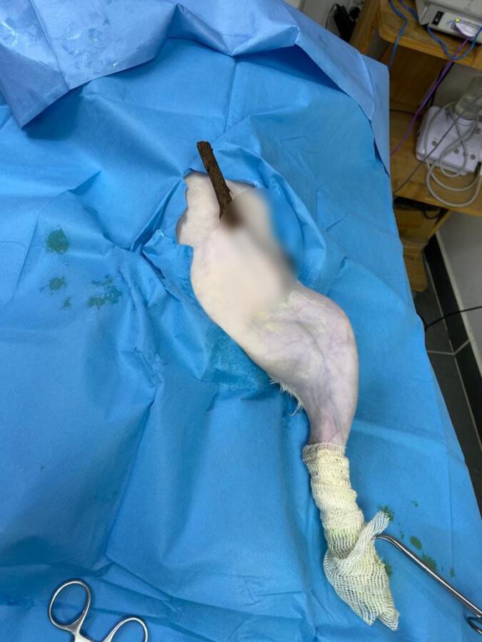 Veteriner Hekim Önder Alkan, “Karabük’ten sevk edilen bir hastamız. Geldiğinde sopa girmiş. Karından girmiş, arka bacaktan çıkmış. Tabi ki burada en önemli şey, fazla zedelenmemiş, müdahale edilmemiş çekilmemiş. Gördüğünüz gibi çekilmiş olsaydı, bize gelemezdi ölürdü. Acil olarak ameliyata aldık. Yabancı cismi yerinden çıkardık. Dokuları onardık. Bir kaç damarda sıkıntı vardı onları da tamir ettik. İnşallah beklenmedik bir şey gelişmezse taburcu edeceğiz. Tabii bu nadir olarak gözüken bir şey. 25 cm uzunluğunda bir odun parçası girmiş. Hayati bir durum olmaması güzel bir durum olması şans. Bize de ulaşamayabilirdi. Bağırsakları patlatabilirdi. İdrar kesesi kaslar. Bunların hepsini onardık. Ana damarların kenarlarından geçmiş. Başarılı bir operasyonla çıkardık” dedi.