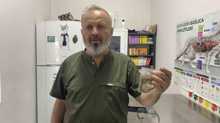 Veteriner Hekim Önder Alkan, “Bazı kedilerde yabancı madde yeme alışkanlıkları oluyor. Genelde vitamin eksikliği nedeni ile olabiliyor. Dün akşam kurdele yediğini sahibi görmüş. Hatta ağzında bir parçasını görmüş. Telaşlanmış. Oradan bize sevk geldi. Bir anestezi altında endoskopi ile çıkardık. Hayvanın karnını açmadan girmeden endoskopi ile çıkardık. Hayvan gayet sağlıklı. Hayatını normal devam ettiriyor. 1,5 metrelik bir kurdele yutmuş. Alınmasıydı ne olurdu? Bağırsaklara geçer bağırsakları tıkar. Daha sonra hayvanın ölümüne neden olur. Ölümcül bir hastalık aslında. Endoskopi ile rahat ve profesyonel bir tedavisi var. Acı çekmeden sıkıntı çekmeden sağlığına kavuştu” dedi.