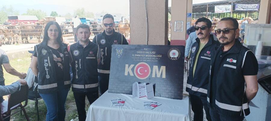 Düzce İl Emniyet Müdürlüğü Kaçakçılık ve Organize Suçlarla Mücadele Şube Müdürlüğü (KOM) ekipleri, Kurban Bayramı dolayısıyla “Paramıza Öğrenelim Emeğimiz Heba Olmasın” sloganıyla başlatılan çalışmada, Yenitaşköprü köyü girişinde bulunan Hayvan Pazarı’nda broşür dağıtarak sahte para ve dolandırıcılık olaylarına karşı satıcıları uyardı.